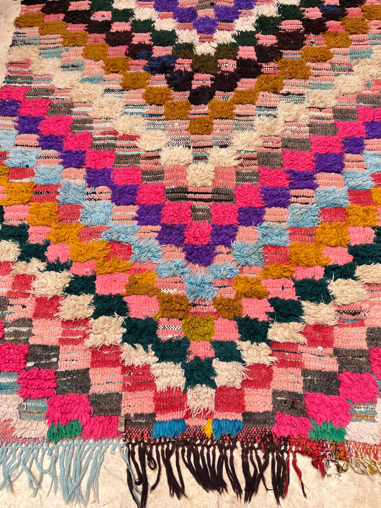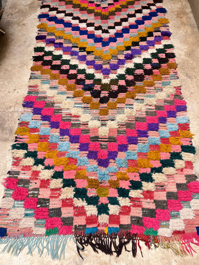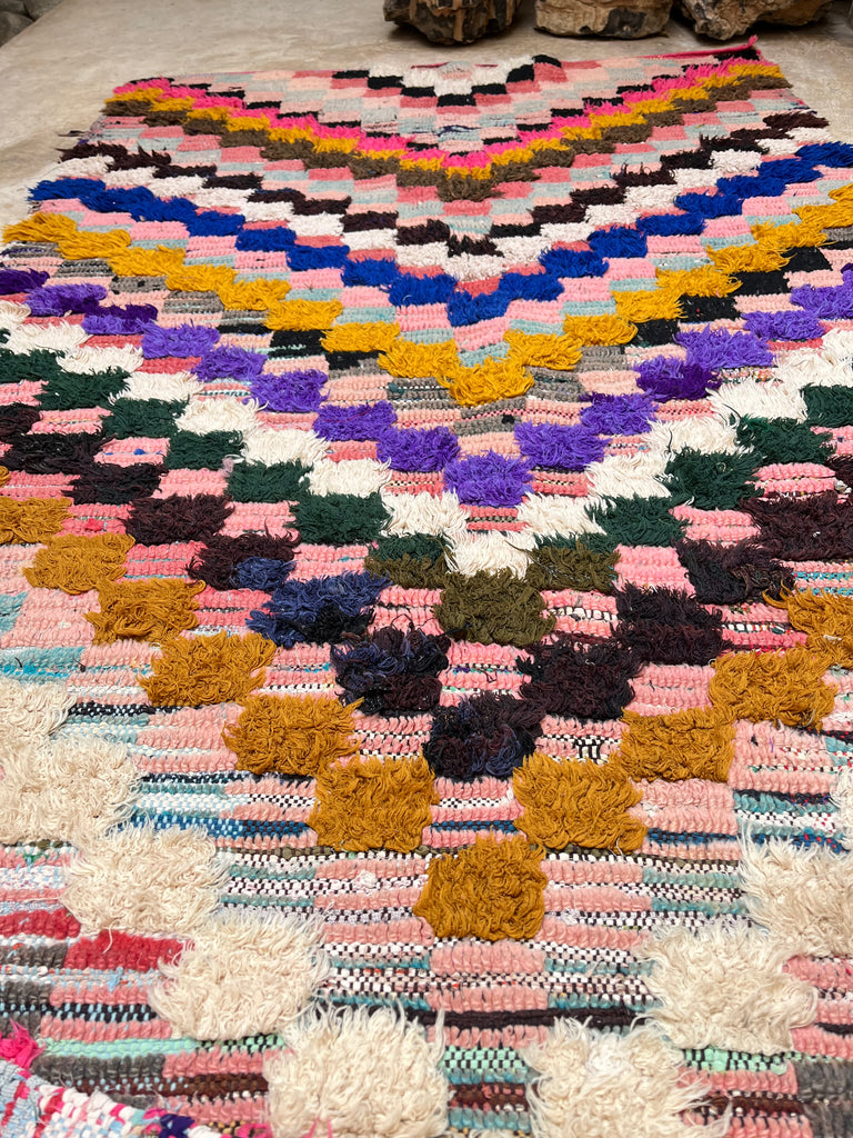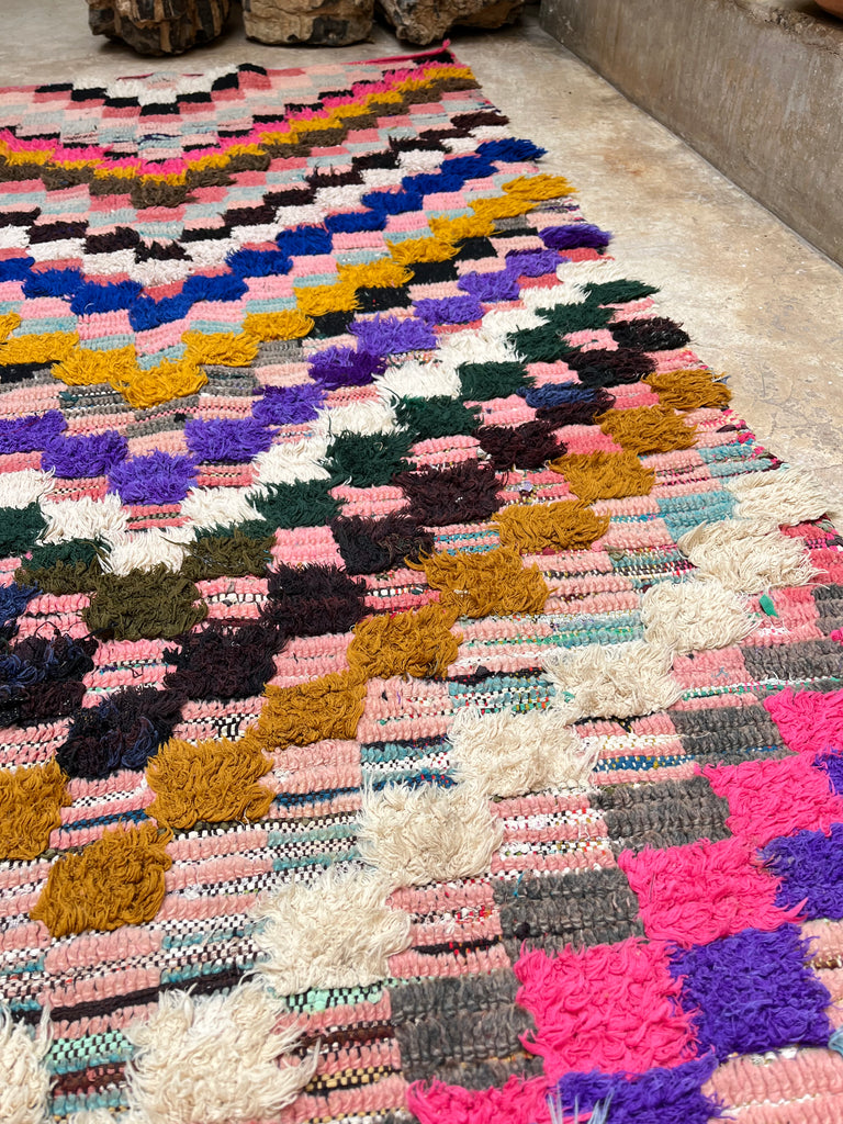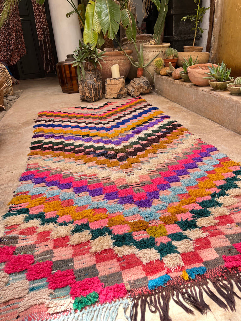 Add a touch of Moroccan charm to your space with this authentic vintage Boucherouite rug, handwoven in the Atlas Mountains. A true one-of-a-kind piece, it tells a story through its vibrant colors, unique patterns, and timeless craftsmanship.