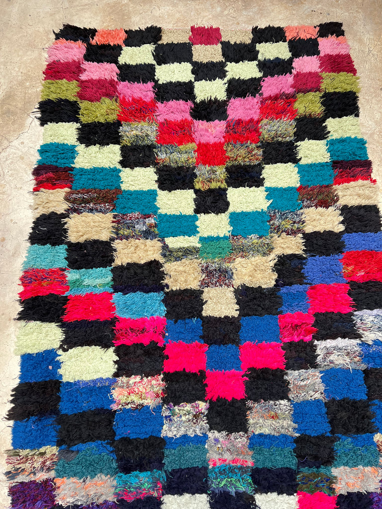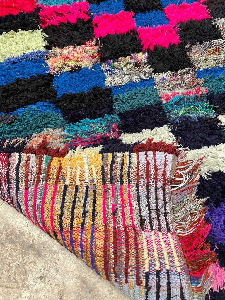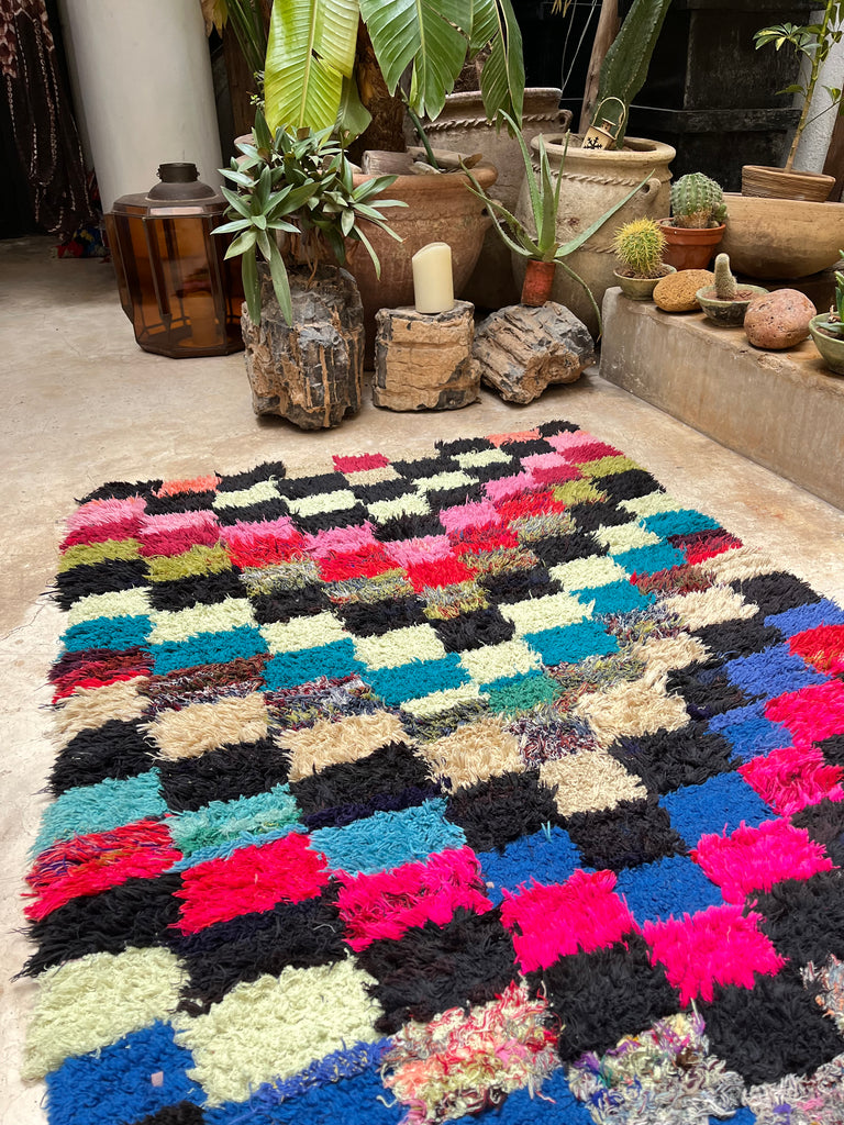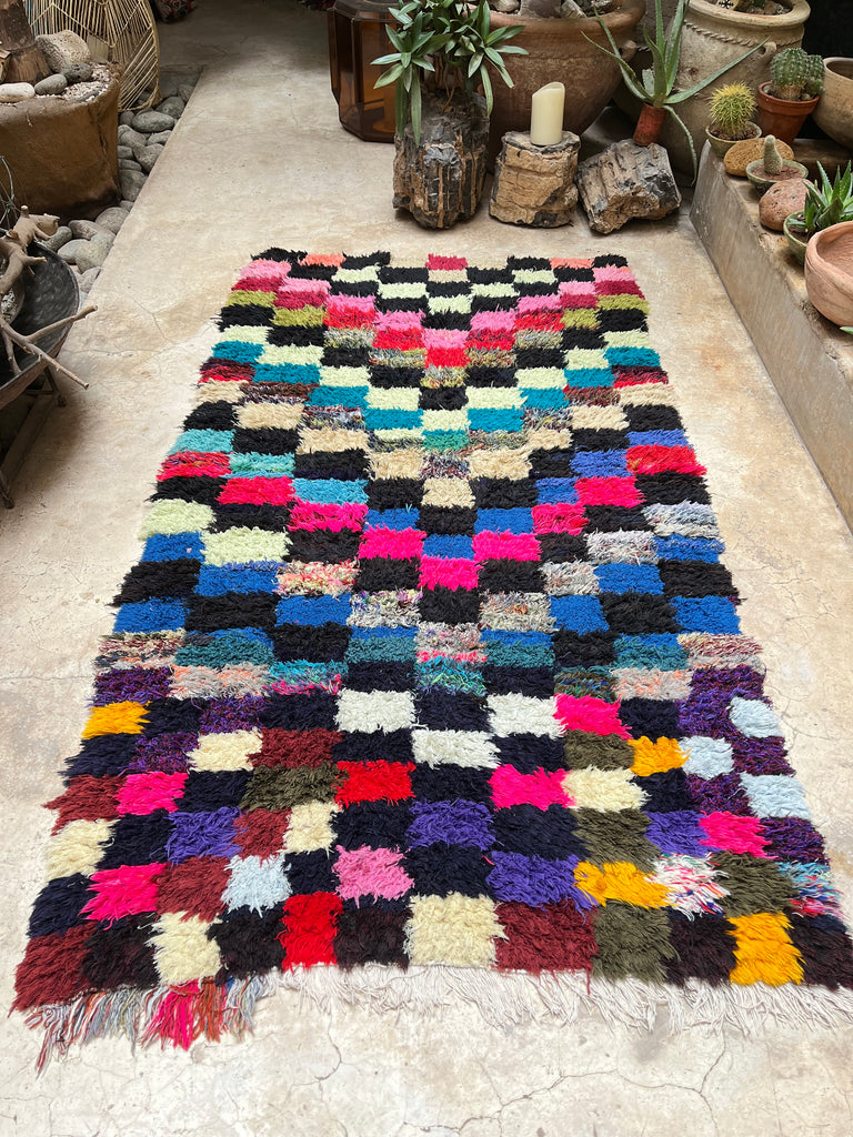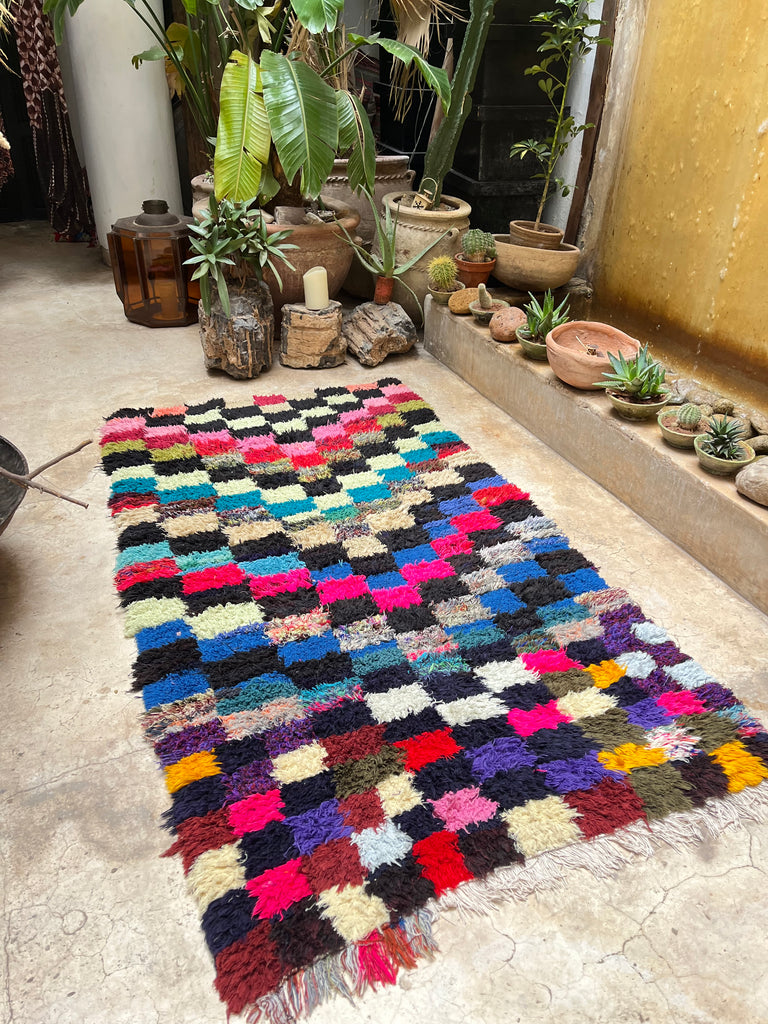 Add a touch of Moroccan charm to your space with this authentic vintage Boucherouite rug, handwoven in the Atlas Mountains. A true one-of-a-kind piece, it tells a story through its vibrant colors, unique patterns, and timeless craftsmanship.